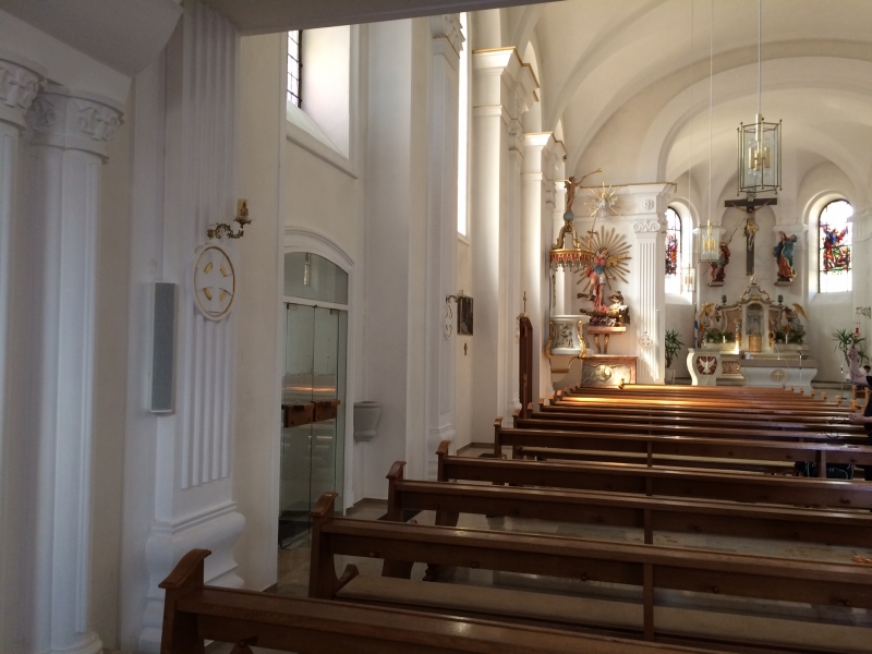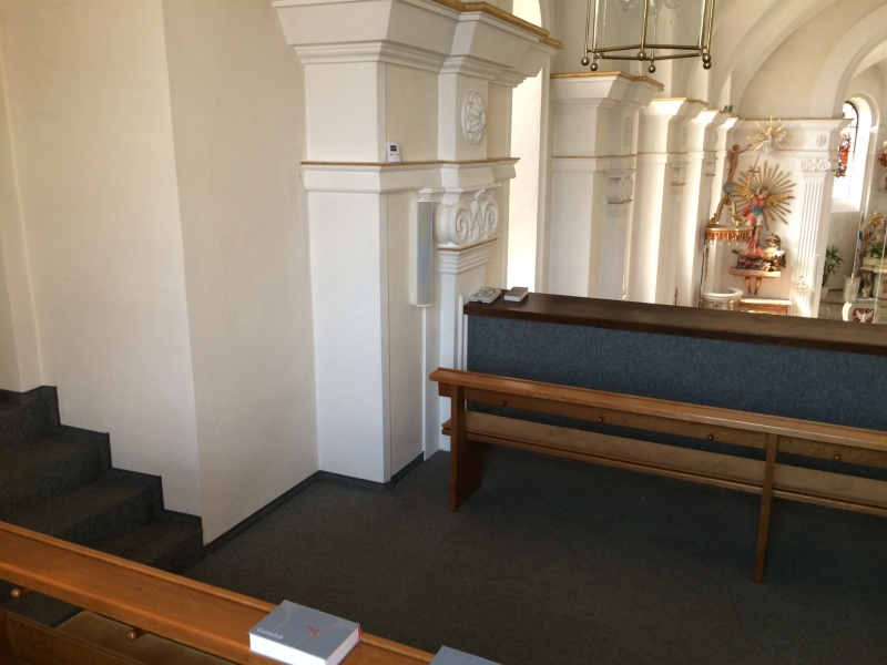 2 ITEC-Neodymline 16/100 V Lautsprecher bilden die Säule für ein gleichmäßiges Beschallungsbild in der Kirche. Je 2 kleiner Neodymline-Lautsprecher unterstüten auf und unter der Empore.